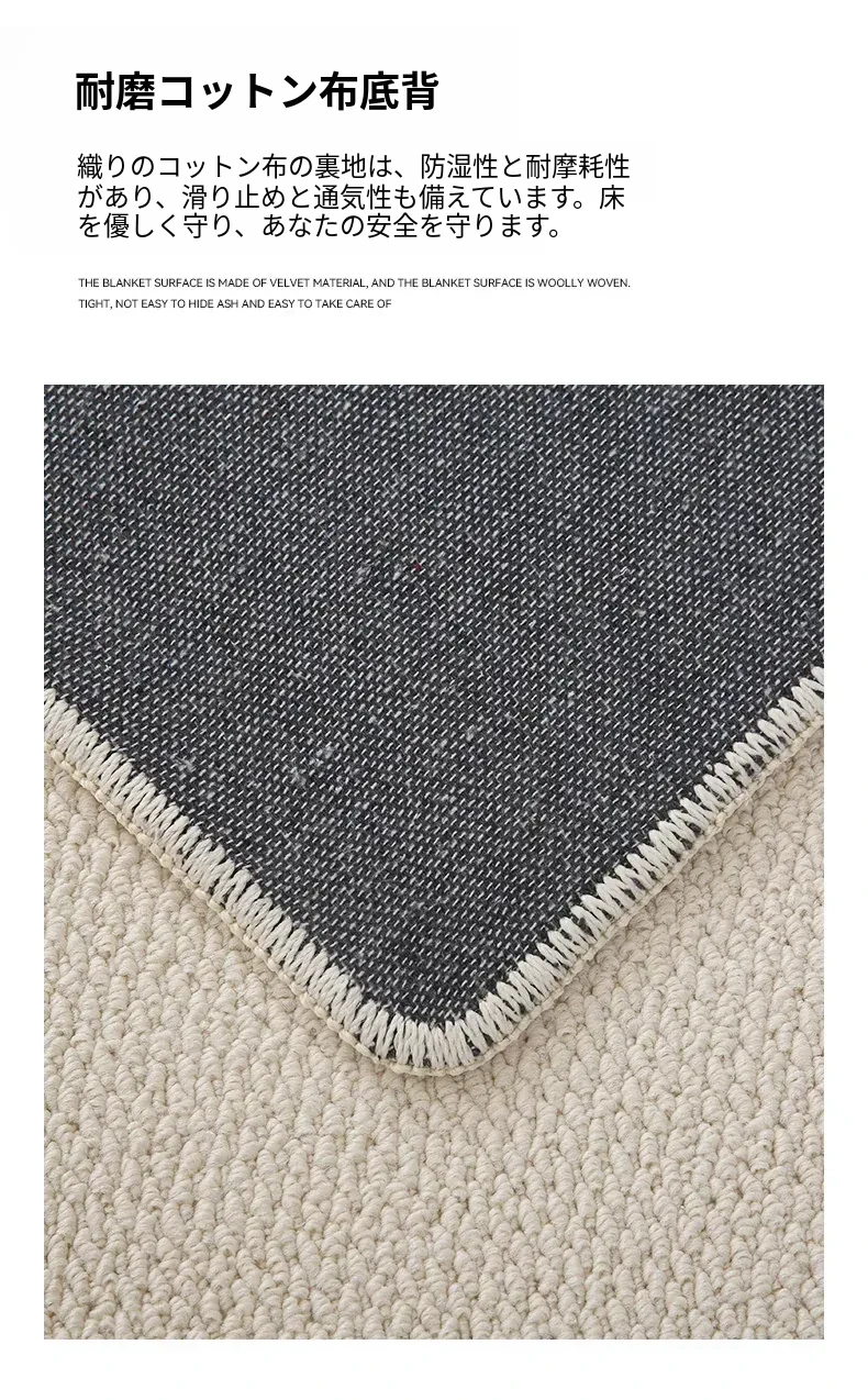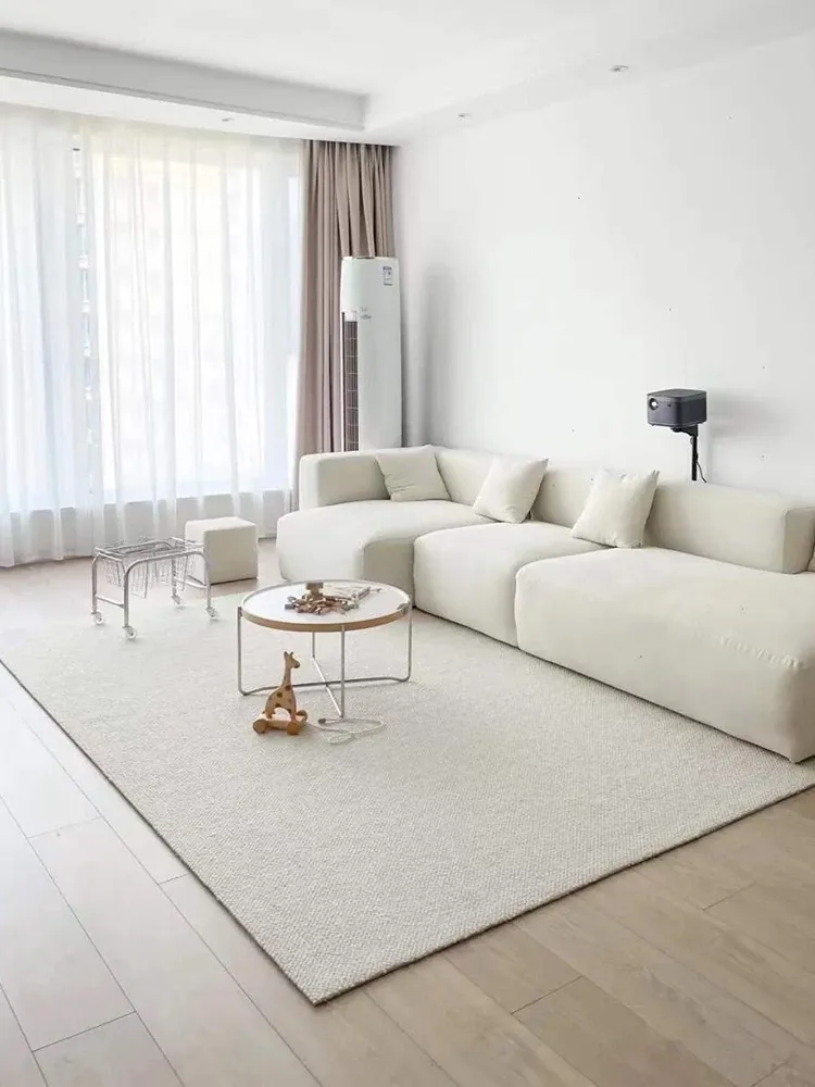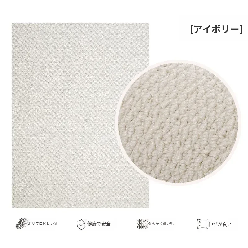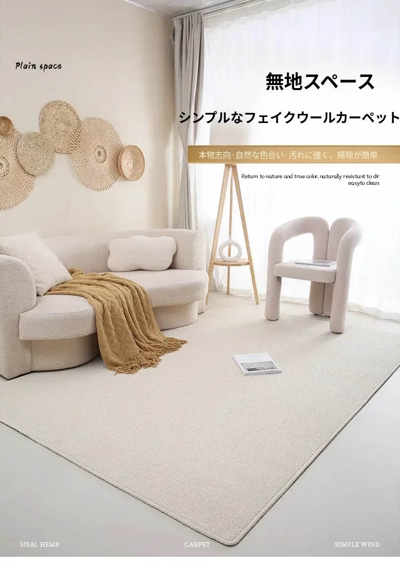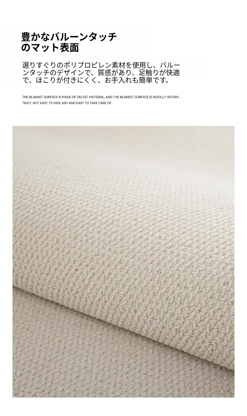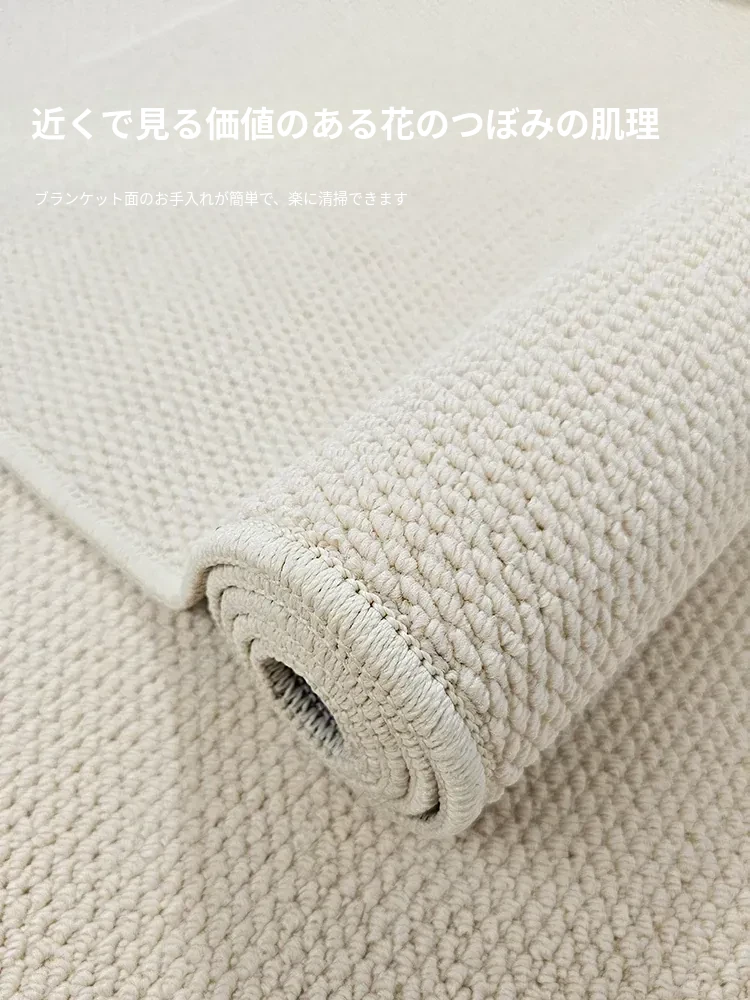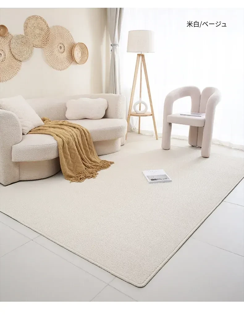 フランス風クリームタッチのラグ – 高級感あふれるホワイトのリビング用カーペット。シンプルで上品な和風ベッドサイドマット。茶色のテーブルにぴったりな侘寂スタイル。