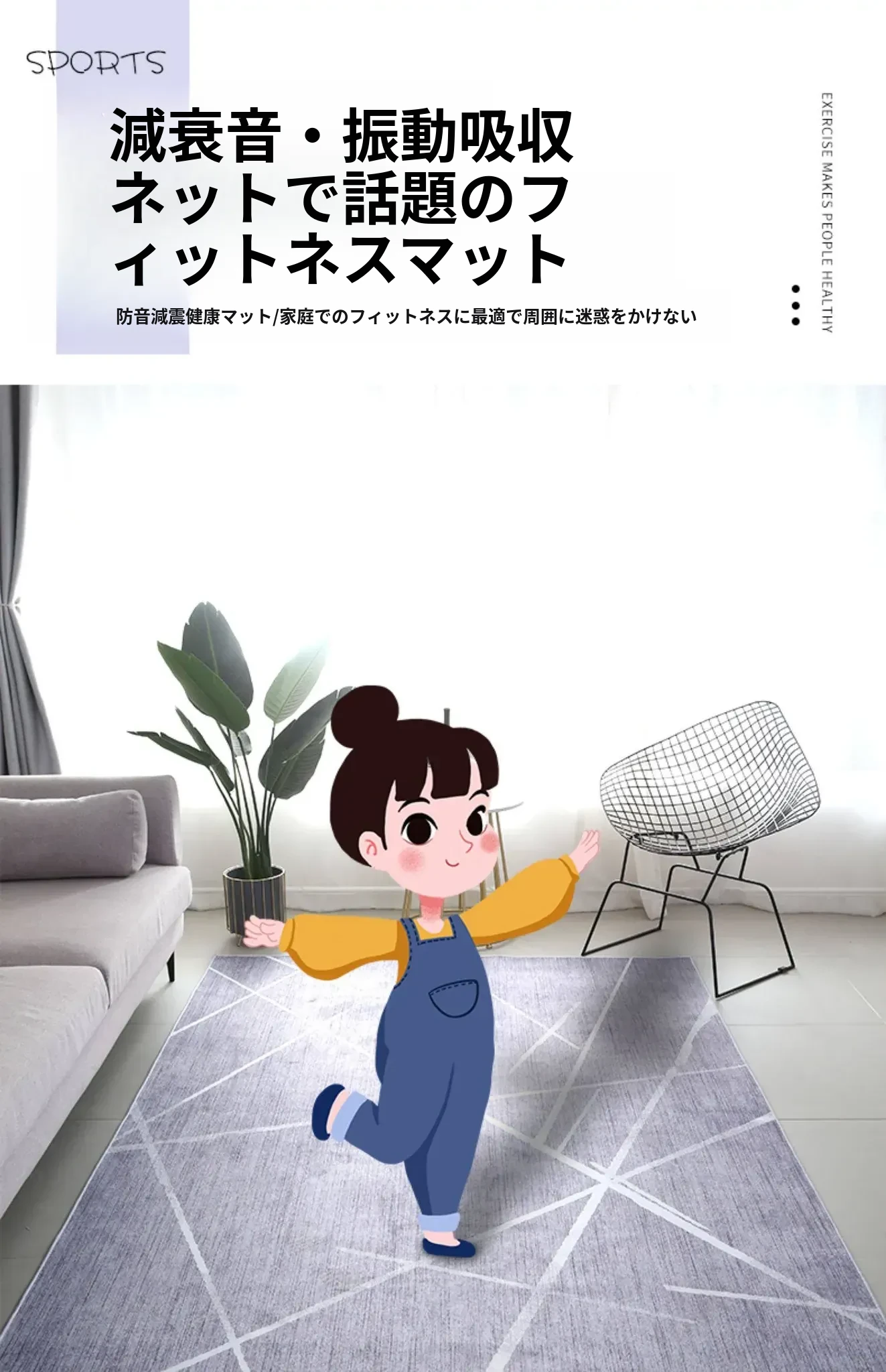 グレーのスポーツカーペット!人気のインドアヨガ・フィットネス用防滑マット。家で使える遮音・防振効果抜群のエクササイズマットで、快適なトレーニングを実現!